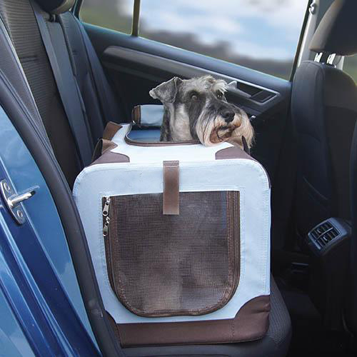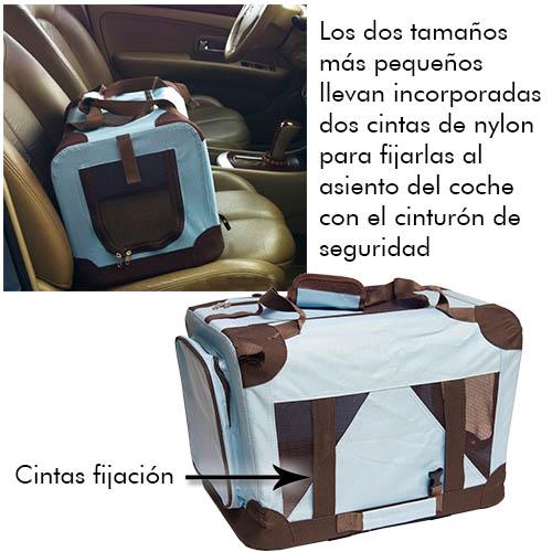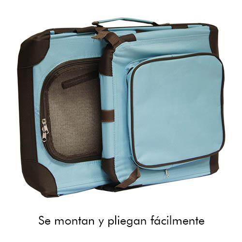 Jaula plegable de loneta para perros. Ligera y funcional; se monta y se pliega fácilmente en apenas medio minuto. Armazón robusto y loneta fuerte. Pesa muy poco. Ideal para viajes. Dispone de un práctico y amplio compartimento trasero. Con puerta de cremallera en el frente y en la parte superior. Disponible en dos colores: azul o camel. Incluye cama de borreguito desenfundable en la base. La loneta y la colchoneta extraíble se pueden lavar en frío. Se pueden utilizar toallitas húmedas para la limpieza diaria. Para gatos y perros muy pequeños la referencia con medida 49 x 34 x 34 cm. es idónea. Aunque aconsejamos medir a su mascota para elegir la jaula correcta en cada caso. ** Los dos tamaños más pequeños llevan incorporadas dos cintas de nylon para fijarlas al asiento del coche con el cinturón de seguridad. Las jaulas metálicas y los transportines de plástico no son "búnkers", mucho menos las jaulas de loneta. Hay muchísimos perros para los que las jaulas de loneta son suficientemente fuertes, porque jamás se atreverán a rasgarlas. No son aptas para todos los perros. El perro debe de estar educado al confinamiento, ya que estas jaulas no soportan ni los rasguños ni las mordidas. Estos perros necesitan jaulas más fuertes como las de varilla de acero (metálicas) o transportines.